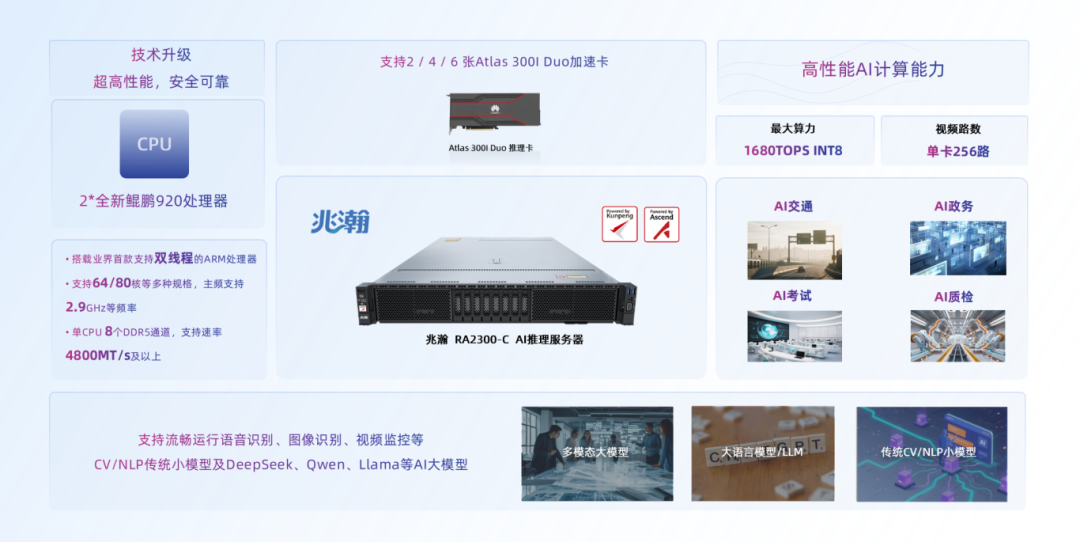 此次发布的新品兆瀚RA2300-C AI推理服务器是一款基于最新款鲲鹏920芯片+昇腾AI推理卡的AI推理服务器,广泛适用于AI政务、交通、考试、质检等多类场景,为行业用户提供高效、安全、可靠的一体化AI推理解决方案,具备诸多令人瞩目的亮点: